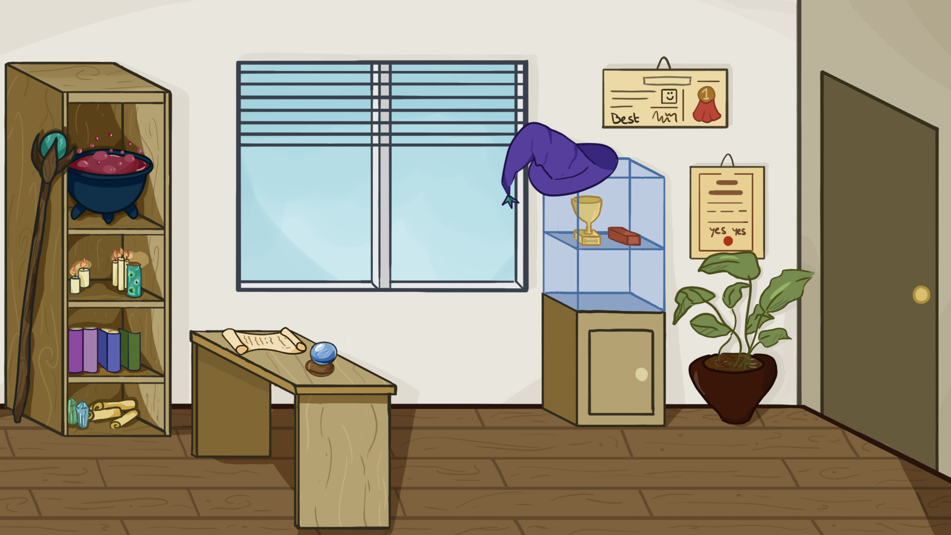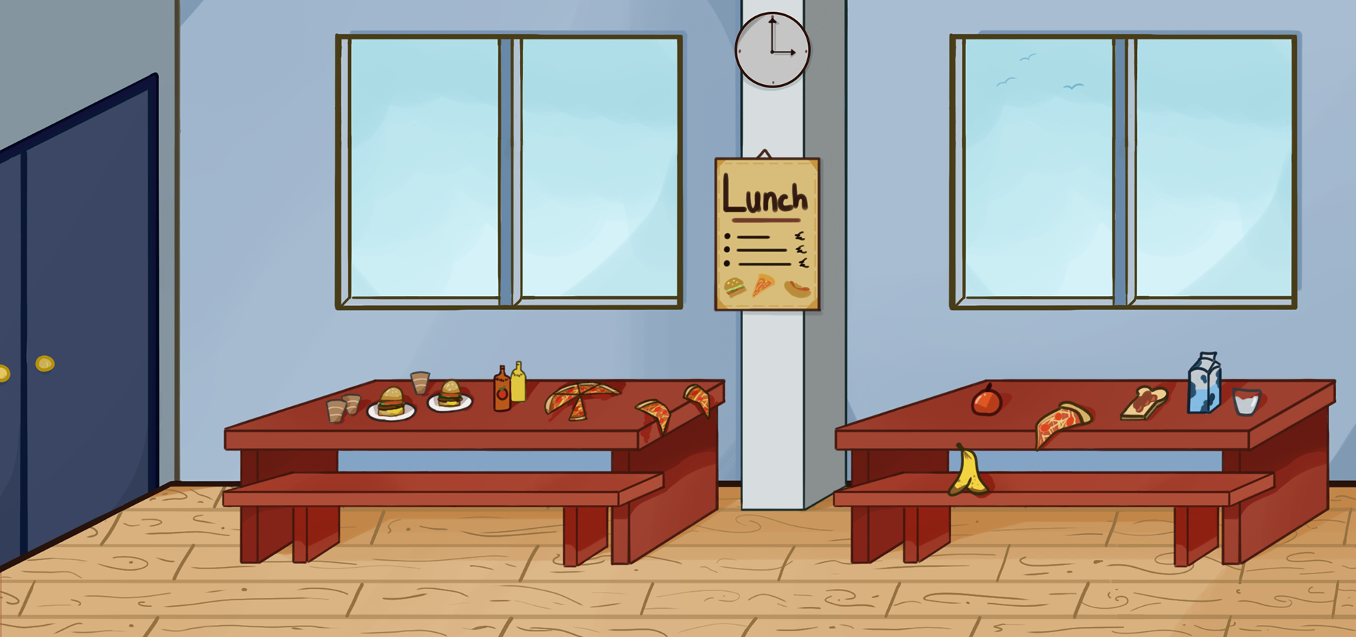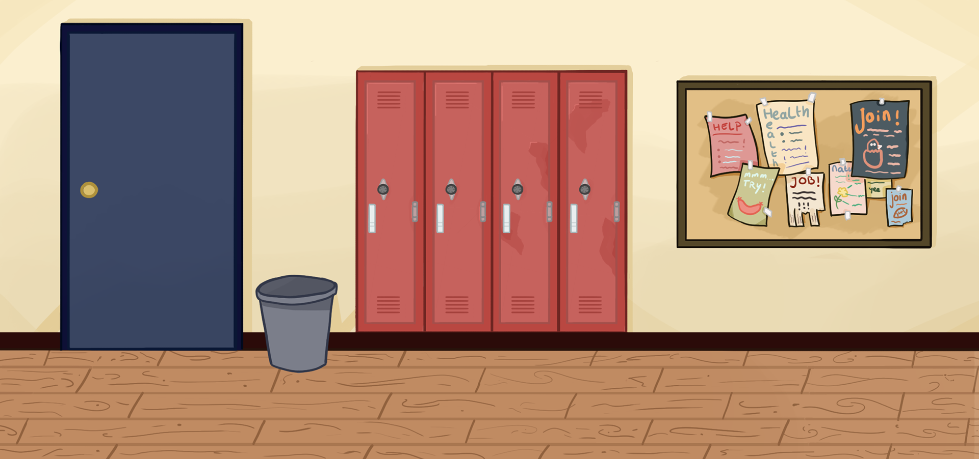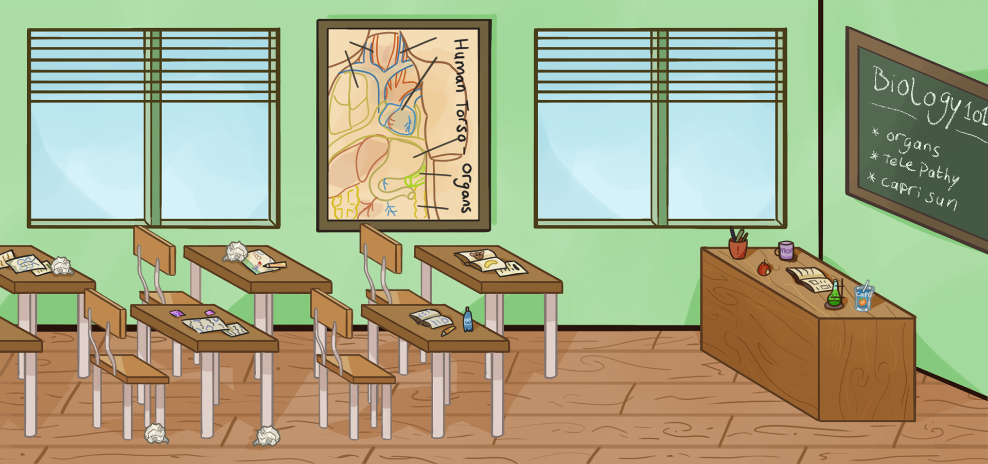 I created the overall visual direction for the game and made sure everything matched the same bold, cartoony style. I illustrated all backgrounds for the different rooms in the school and designed a custom hand-drawn font that gives the dialogue and UI a fun, handmade look. I also created all UI elements and kept them simple, clear and consistent with the rest of the art.