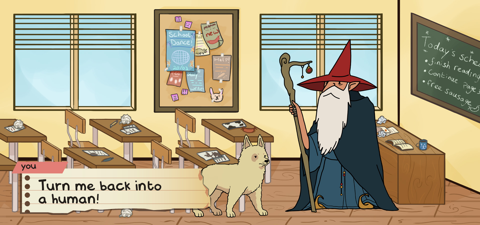 DOG: Become Human is a silly and slightly chaotic 2D story game about a student who accidentally gets turned into a dog. While the principal tries to reverse the spell, the dog wanders around the school helping other students with their strange little problems. The tone is playful and a bit absurd, and I wanted the art style to feel like a cartoon that never takes itself too seriously.