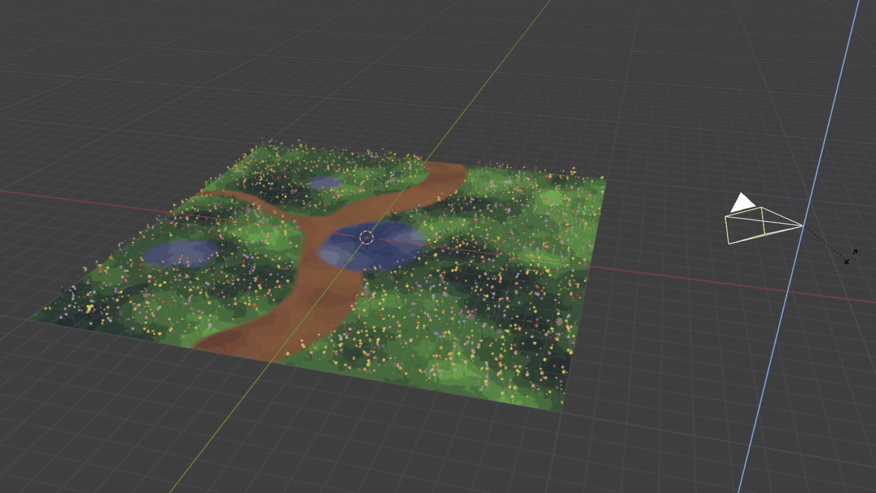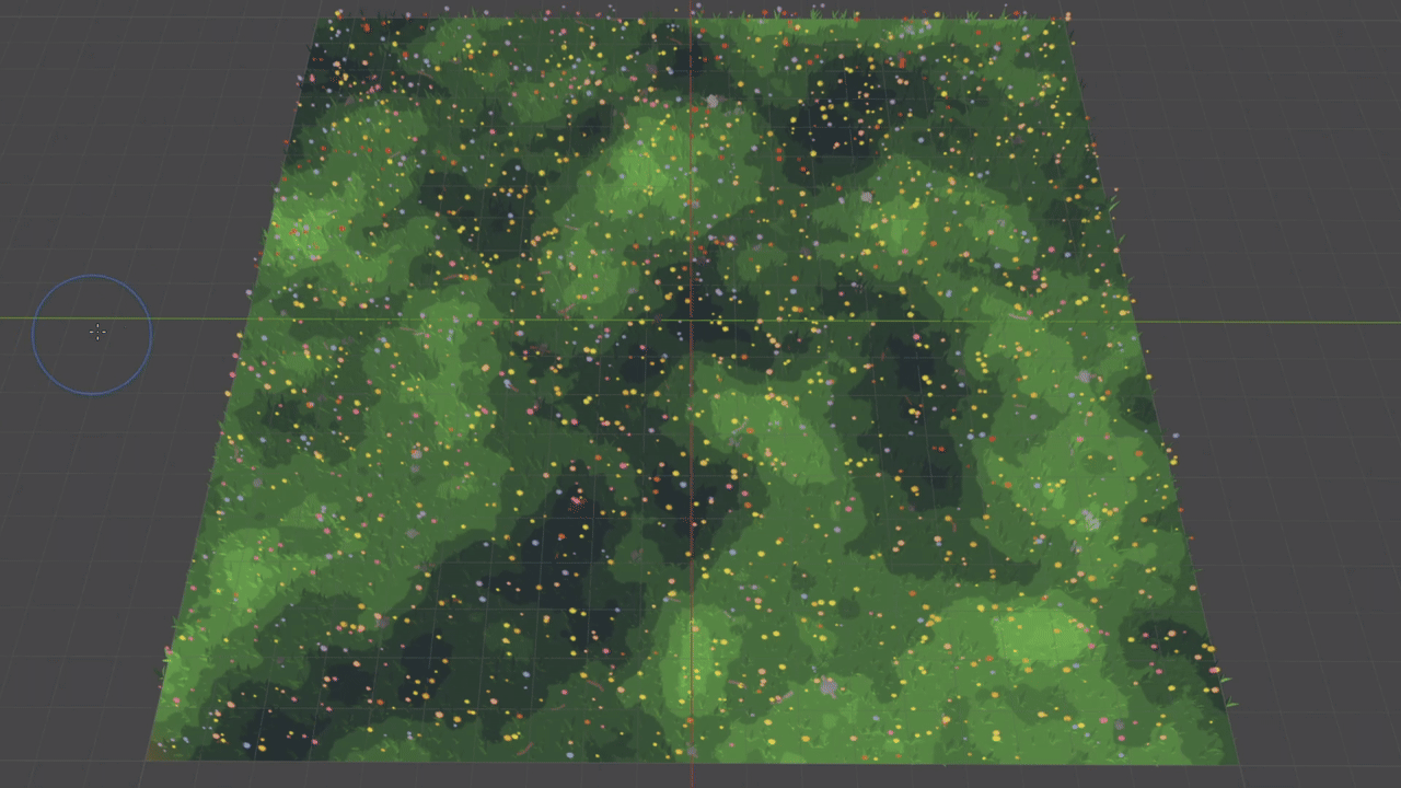 I built the whole system in Geometry Nodes, starting with the grass scatter and then expanding it with flowers, pebbles and small clutter. I set up a mask that lets you paint paths or puddles directly onto the terrain, and the generator reacts by clearing the grass in those areas. I also made the flowers face the camera to keep them readable in any shot. All colors and amounts can be changed from a few simple sliders.